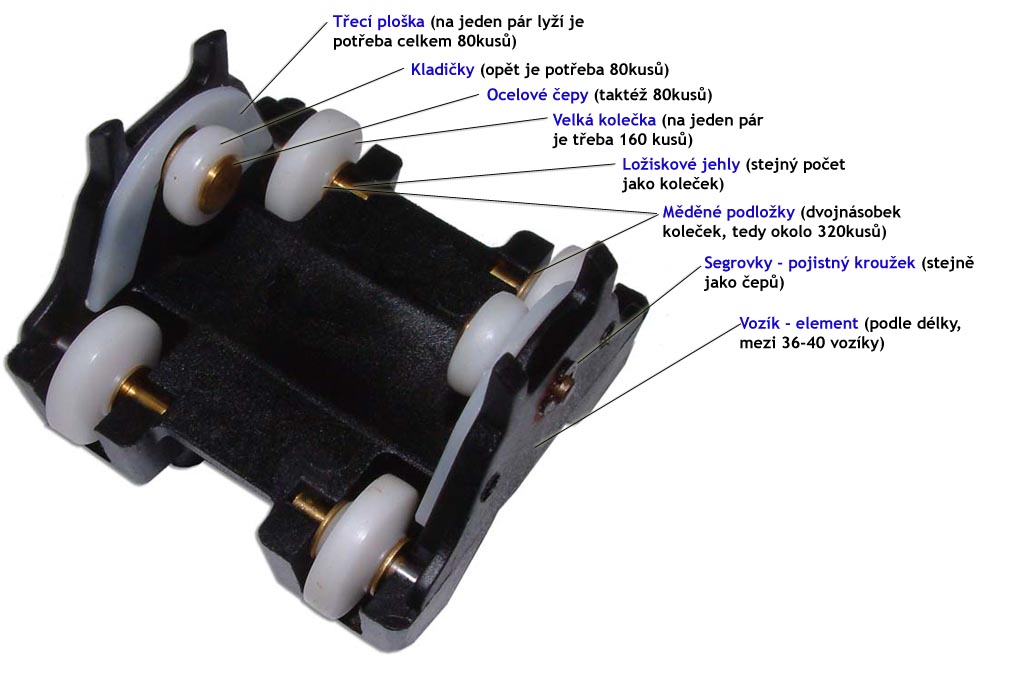 | Zde je vozík, ve kterém je pouze dvojice třecích plošek (to bílé na obou stranách). Na zkompletování vozíku je dále potřeba dvojice malých kladiček (zvané kladičky) s podloškami, čepami a závlačkami, dále pak 4 velká kolečka s oskami a 8 podložek. Celkem se tak jeden vozík skládá z 27 dílů. |
